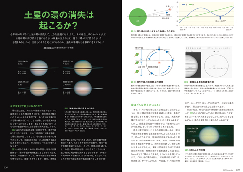 2025年には地球から見て土星の環が見えなくなる「土星環の消失」が2回起こりました。そして11月25日ごろ、土星環が極薄の状態になるため、土星の環が見えない状態“準消失”が起こりますが、その観測のポイントを解説します。15年ごとにめぐってくる土星環の消失は、今回が最後になります。再び環のない土星の姿を目にするチャンスは15年後となるため、見逃せません。