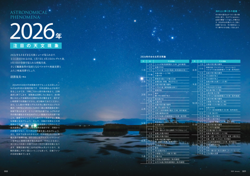 毎年好評の天体写真カレンダーが特別付録。月ごとに見ることのできる天文現象を掲載。星空観望にも役立つミニカレンダーです。