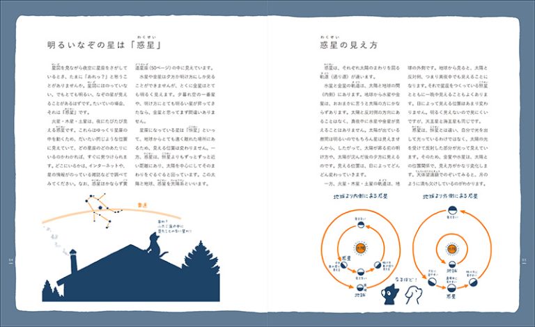 本書では、星や星座見つけるために、季節ごとに探しやすい星座から順に紹介しています。ページを進めていくうちに、星座の形を覚え実際に星空を眺めたくなるでしょう。そして本書と実際の星空を何度も見比べて見ているうち、星座を見つけるコツがわかり、星座がすぐに見つけられるようになります。