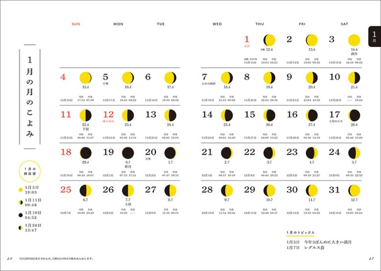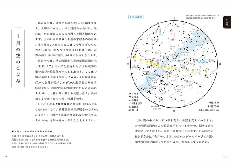 この本には、2026年の毎日の月の満ち欠け、月の呼び名、旧暦、二十四節気、スーパームーンや月食などの情報に加え、毎日の月の出没時刻、毎月の星空(星座)、流れ星が多く見られる日など、役に立つ情報が満載です。