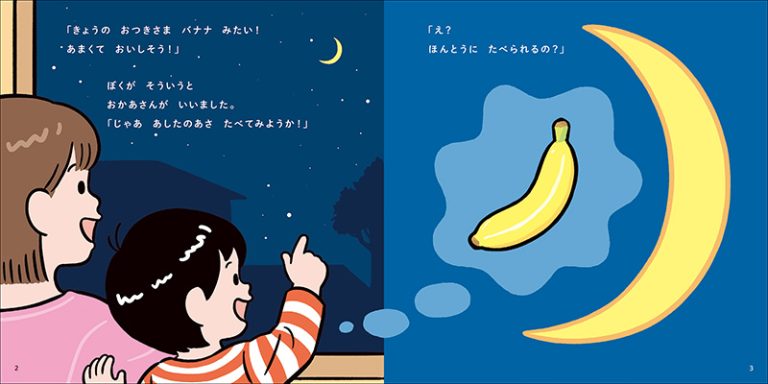 三日月はバナナ、満月はハンバーグ、新月はチョコレートケーキ…!いろんな食べ物を想像する絵本です。