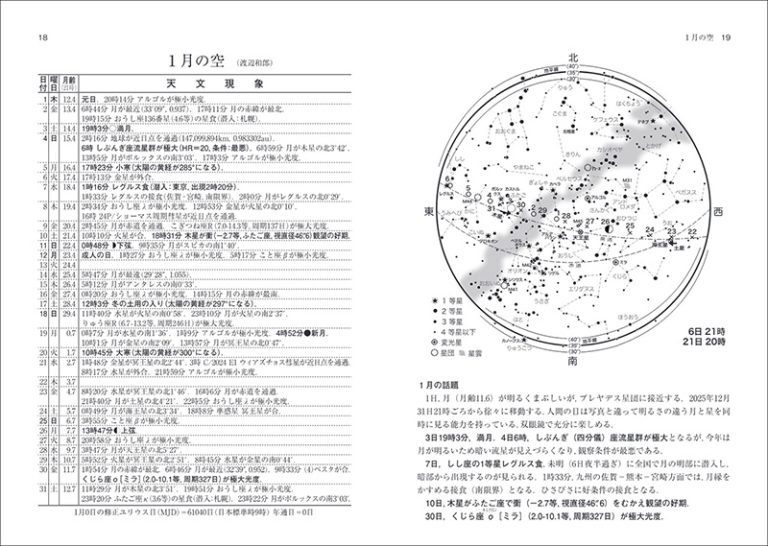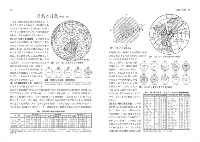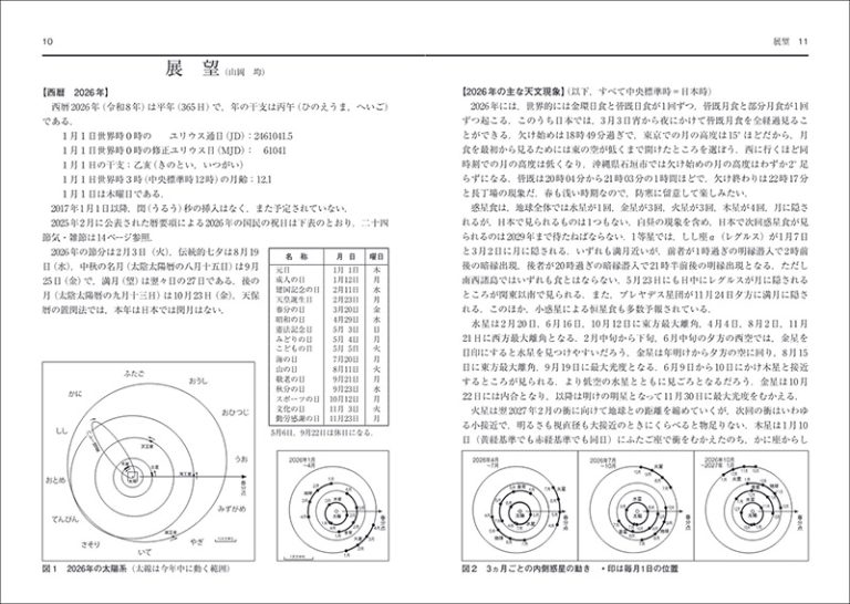 展望/毎月の空/日食と月食/2026年の主な星食/惑星食/2026年の接食/2026年の小惑星による恒星の食/2026年の流星/太陽・月・惑星の正中・出没図/日本の日出没時刻と月出没時刻/日本各地の日出没時刻と月出没時刻/天体の高度・方位・正中時・出没時/天体の高度・方位・正中時・出没時/世界時0時のグリニジ視恒星時/太陽のこよみ/太陽面の経緯度/月のこよみ/太陽の月面余経度と月面緯度/月の首振り運動(秤動)/惑星のこよみの解説/水星/金星/火星/木星/土星/天王星/海王星/準惑星・冥王星/小惑星/近く訪れる彗星/連星/変光星