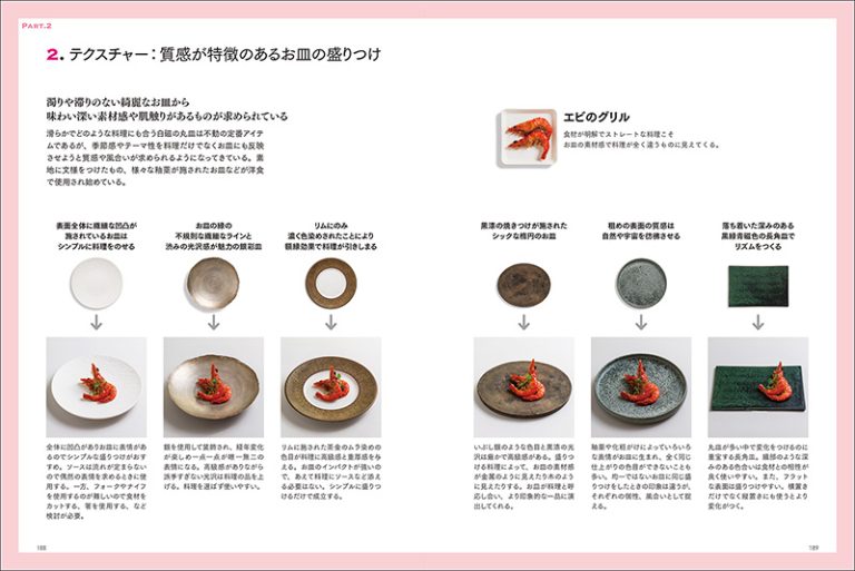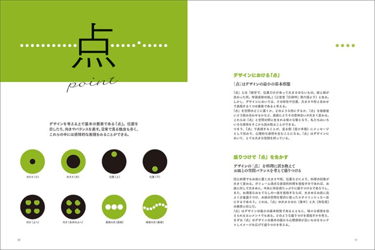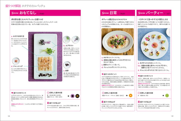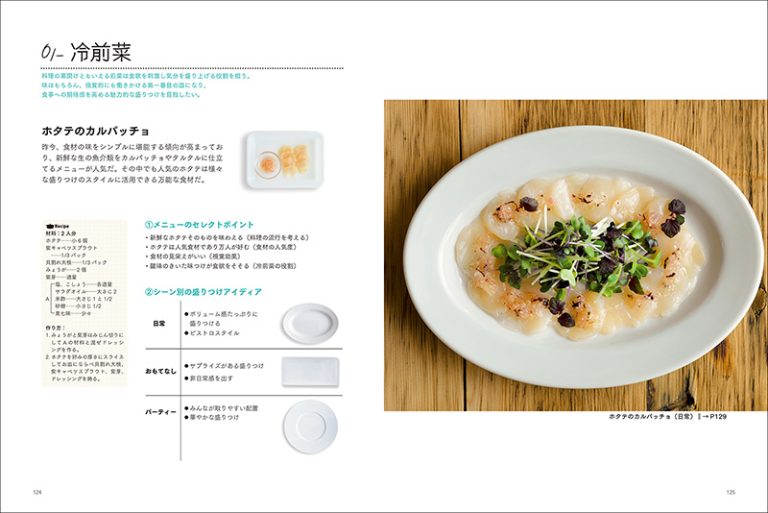 本書では、デザインから考える盛りつけのベーシックから提案。「点」「線」「面」「立体」「色」などのエレメントをお皿の上にビジュアル化し、料理に展開していく方法を紹介していきます。あわせて、盛りつけの視覚効果などを解説。また、シーン別に同じ料理(メニュー)を盛りつけ、それぞれのお皿のセレクト、盛り付けの構成の考え方などの違いを紹介します。