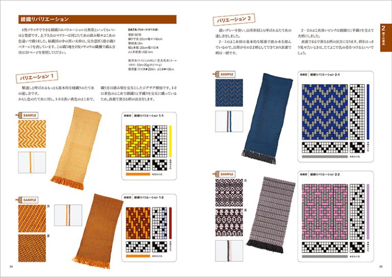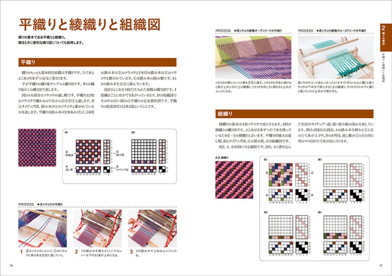 高機、卓上機織りを含め、さまざまな織機を紹介しつつ、その使用法と織り方を詳しく紹介した手織りの決定版となる書籍です。織機の分類から、織り図の見方、織り技法(縞とチェック、透かし織り、浮き織り・はさみ織り、綾織り、綴れ織り、二重織り・袋織り、裂き織り、変わり素材、変わり糸、絣など)、名古屋帯の織りと仕立てなど、知っておきたい情報をこの1冊に集約しました。織り技法を大きく分けると13項目、さらに各々5〜10パターンくらいの織り方を紹介しているので、計100種類以上の織り方を掲載。すべての織り技法を取り入れているので、初心者から上級者までのすべての人にとって参考になる本といえます。