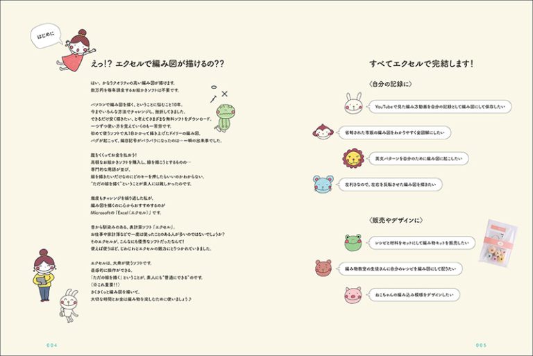この本は、エクセルで編み図をつくる方法を教えてくれる本です。編み図を自分で描きたい人、たとえば編み物作品を作ってキット(材料+編み図)にして販売したい人はもちろん、編み物講師、編み物作家などもワークショップやお客さま対応などで編み図を起こすこともあり、このような編み物を仕事としている人にとっても、お客さまとの接点は増え、収入を得る機会が得られるアイテムとなります。