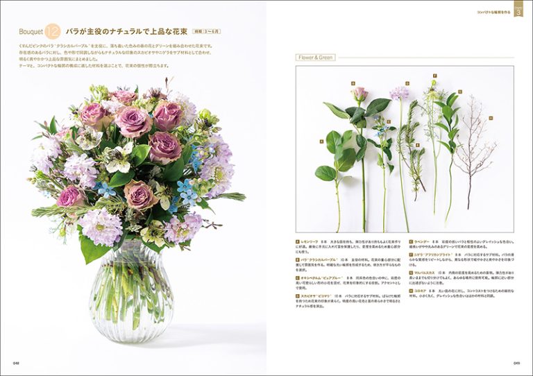 初心者にも理解できる花束の基礎から中級者の参考にもなる応用作品まで技法別に紹介する。
