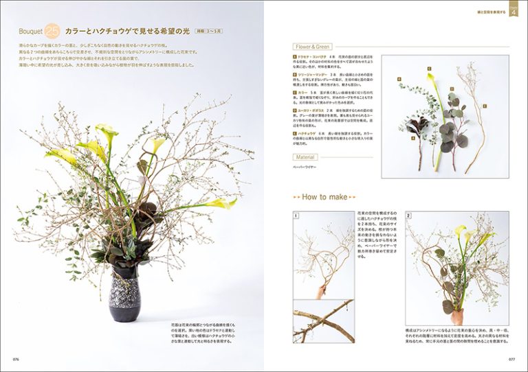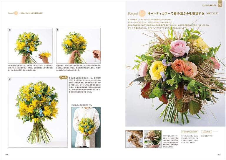 ハウツーでは、選んだ花材とその役割の解説のほか、テクニックのポイントとなる部分をさまざまな角度から撮影したり、一つひとつの手順を丁寧に追っています。初心者にも理解できる花束の基礎から中級者の参考にもなる応用作品まで技法別に紹介します。
