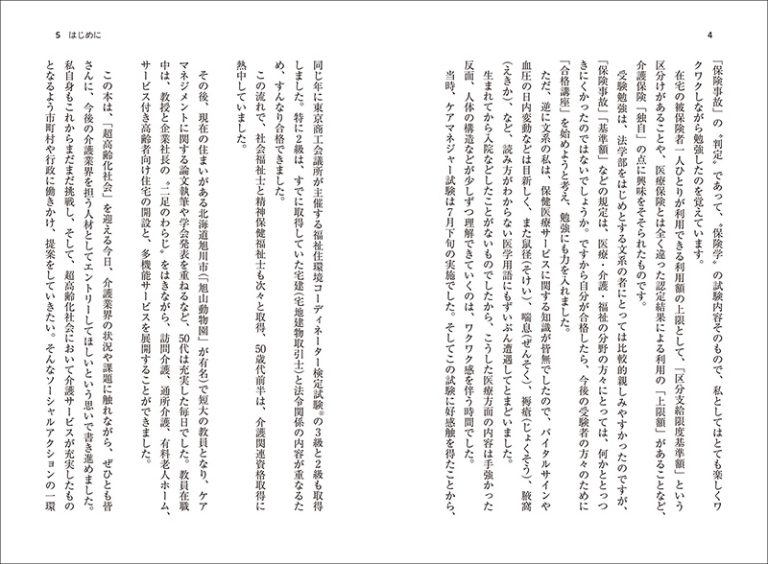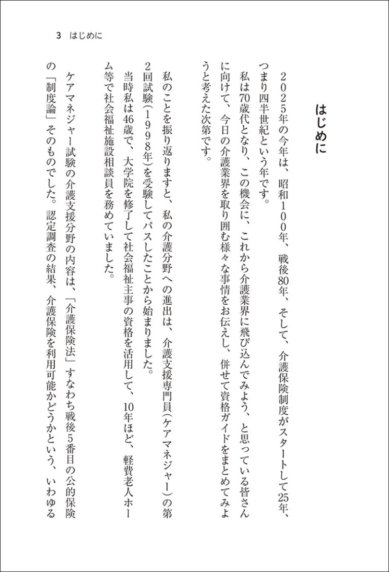 介護は決して楽な仕事ではありません。しかし、超高齢者社会の現在、みんなで取り組んでいく必要があり、また、ちょっとした縁のつながりが大きなやりがいにもなります。本書が、介護の世界に踏み出す皆さんにとっての道しるべとなることを願ってやみません。