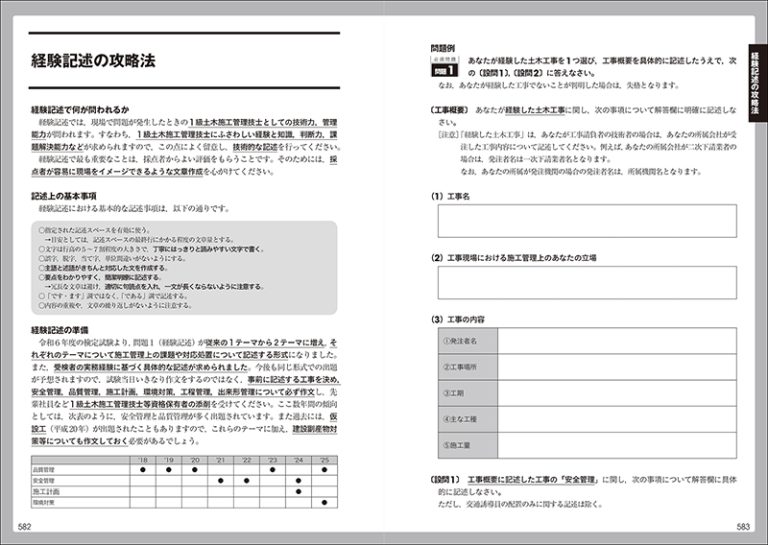 巻末には、経験記述についてその攻略法を掲載。経験記述をする工事の選び方から記入上の注意、事前準備の仕方まで、どんな工事内容にも使える解答テクニックを紹介しています。
