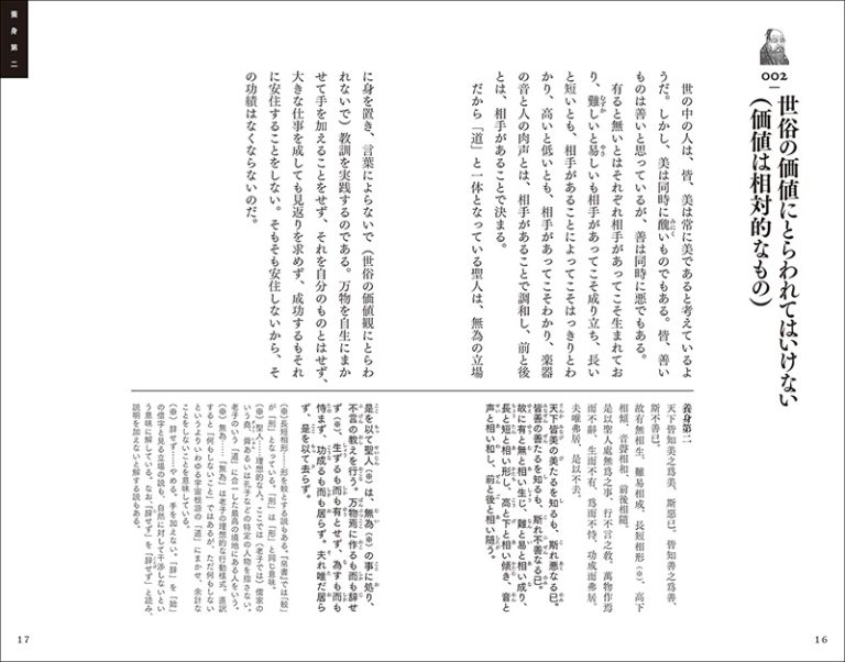 本書では全文の現代語訳、書き下し文、原文に加え、【一文超訳】を掲載。テーマは何か、主旨は何かが一目で把握でき、格言のように心に刻まれるので、「老子」の理解が飛躍的に向上します。また、主要な人名や語句には懇切丁寧な注釈を入れた、現代の完全版が新装版で登場。