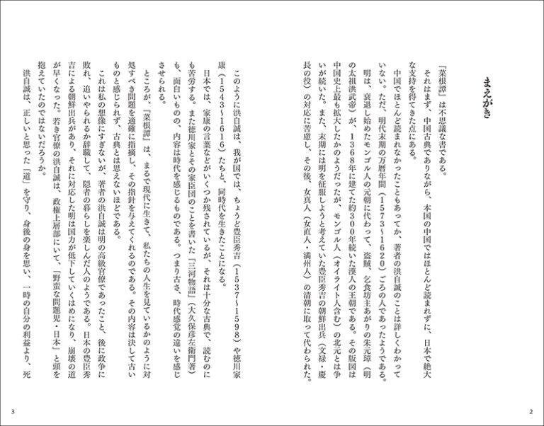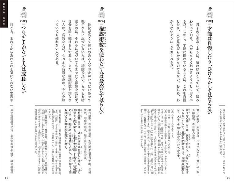 現代でも十分に通じる市井の哲学ともいえるこの書は、書名のとおり、じっくり噛みしめてこそ味わいが心身に染みわたります。処世術だけを部分訳したビジネス本、子ども向けの超訳本など、これまでにさまざまなアプローチで紹介されてきましたが、全文を原文、書き下し文とともに網羅した本は数少ない。