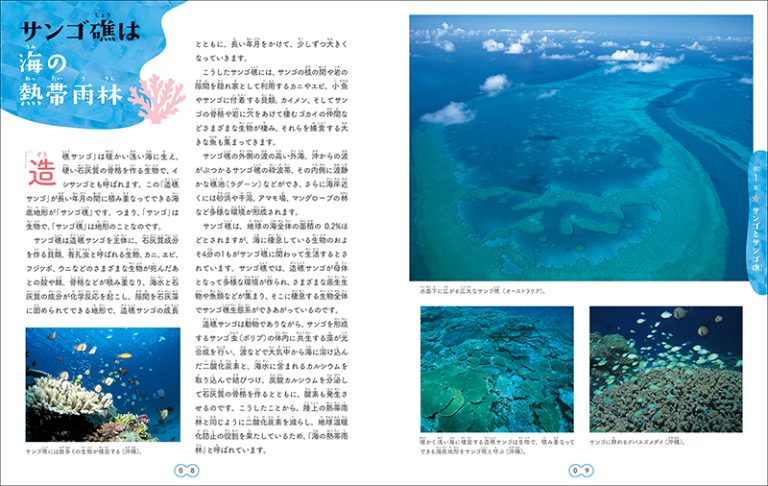 本書のテーマは「サンゴ」です。サンゴは海に生きる生物ですが、長い年月をかけて積み重なると「サンゴ礁」という海底地形になります。