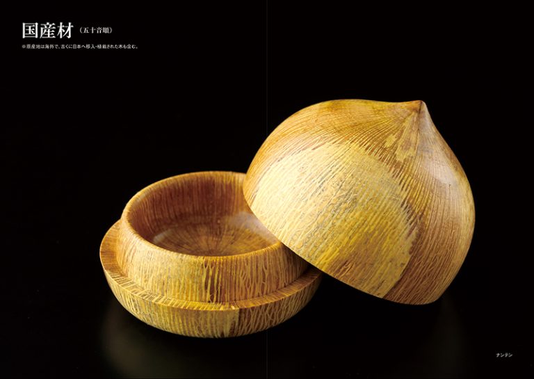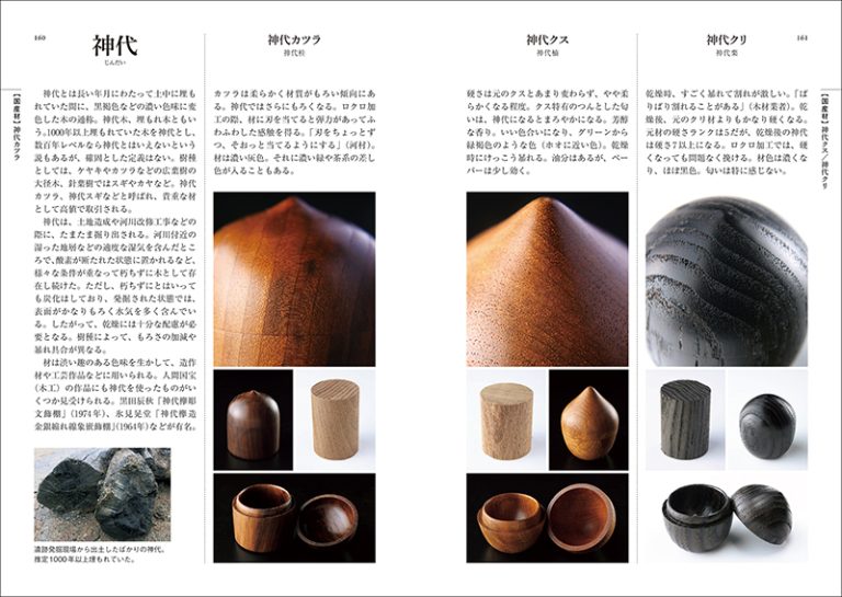 小箱の曲面に現れた木肌や杢が鮮明に見える写真を掲載(従来の木材事典では、平板の写真が掲載)。加工前の木地を含めて1樹種につき4カットを基本とする。