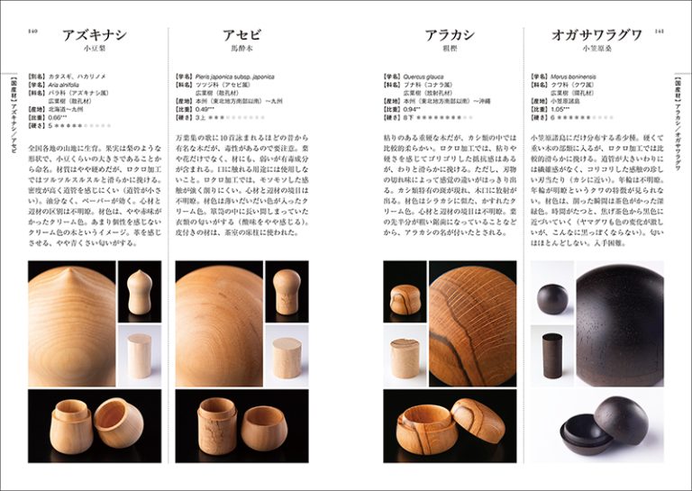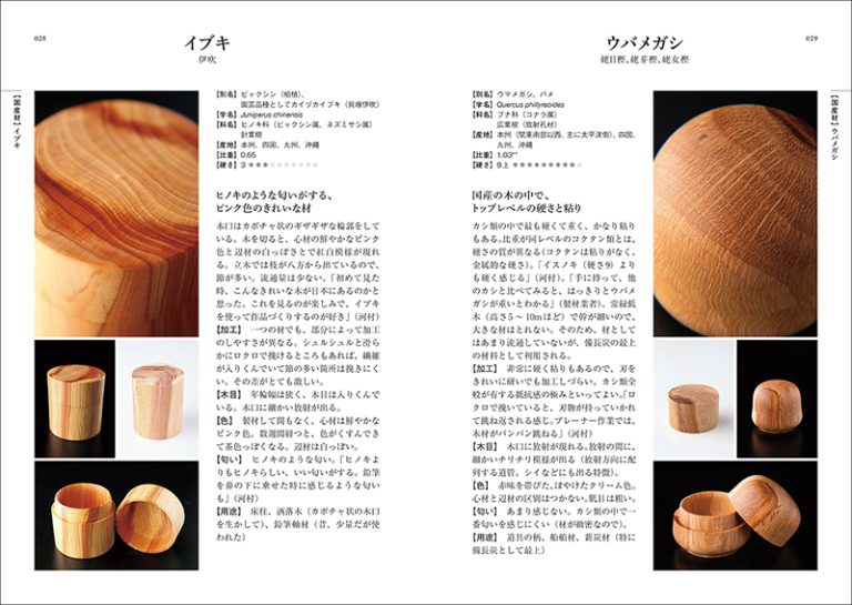 硬さ(1~10までランク付け)、加工のしやすさ、木目、色、匂いなどの特徴を樹種ごとにわかりやすく説明。木材の使い手(木工関係者、インテリア関係者、木材業者など)にとって、有益な情報が満載。例えば、「逆目を感じず加工しやすい。ロクロ加工では、繊維の影響を受けずサラサラと挽ける。油分なくペーパーが効き、仕上げ後に粗が目立たない」など。
