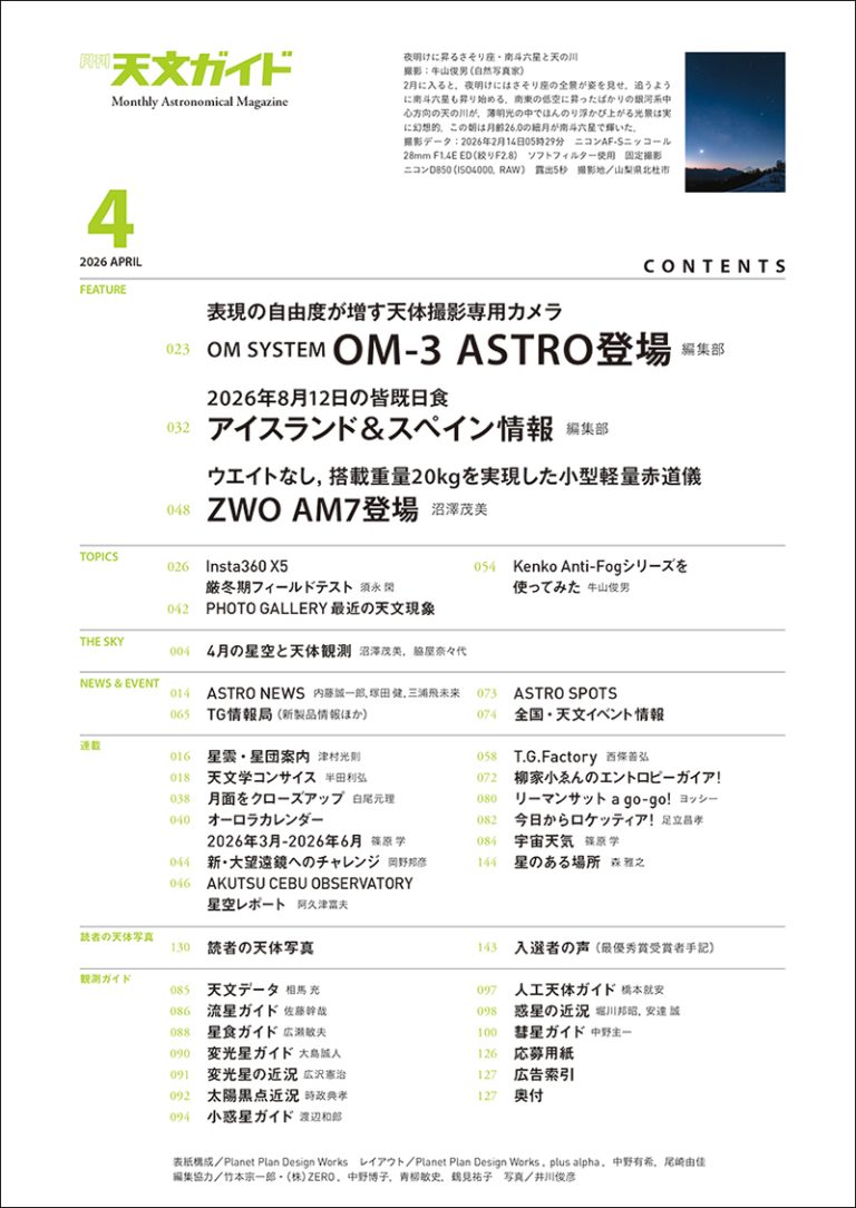 1965年創刊。星空と宇宙に関心がある人のための月刊誌。話題の星空イベントの楽しみ方から、注目の宇宙の話題までをわかりやすく紹介します。星空観察の仕方、最新の宇宙探査の解説記事、星空風景写真を初めて撮る人のための撮影方法紹介、天体望遠鏡の使い方、注目の天文グッズ紹介、ディープな天体写真撮影テクニックなど、ビギナーからベテランまで楽しめる幅広い内容です。記事と連動した星空動画は天文ガイドYouTubeチャンネルに毎月アップ。電子版でも購読いただけます。