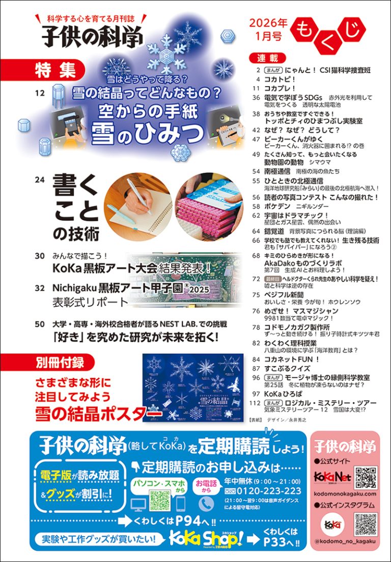 寒い冬の日に降ってくる雪。実は日本は世界でも有数の降雪地帯なのは知っていましたか? この特集では、雪の謎について迫ります。そもそも、どうして雪が降るの? 氷とは違うの?といった疑問から、粉雪とぼたん雪の違い、雪崩が起きるメカニズムの疑問に答えます。後半ではきれいな雪の結晶を紹介。みなさんも観察できる方法も解説します。雪が降ったらぜひチャレンジしてみてください!