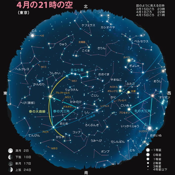 夜空では、南の空高くにしし座が輝き、北の空には北斗七星が見やすい位置にあります。アルクトゥルス、スピカ、デネボラが形づくる春の大三角や、北斗七星から続く春の大曲線が星空を彩ります。また、うみへび座が南の空に長く横たわり、その全体像を見渡せるのもこの季節ならではです。